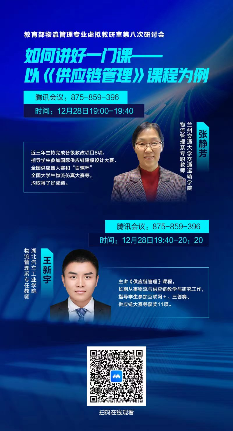 2023年12月28日,教育部物流管理专业虚拟教研室第八次研讨会线上会议成功召开,会议主题为“如何讲好一门课——以《供应链管理》课程为例”,经济管理学院青年教师王新宇应邀参加此次研讨会并做主题报告。
