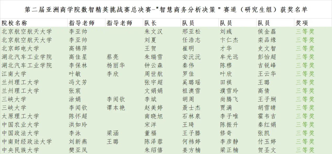 团队的力量,智慧的较量!在总决赛和区域赛的的激烈选拔中,必赢亚州242.,net研究生团队展现出了卓越的才智和坚韧的毅力。他们凭借出色的表现,成功斩获了总决赛一二三等奖和区域赛二等奖的殊荣。这不仅是对他们个人能力的肯定,更是对湖北汽车工业学院教育质量的认可!本次在第二届亚洲商学院数智精英挑战赛暨第五届全国大学生智慧商务大数据创新应用大赛中取得的优异成绩,是学校教育成果的生动体现,让我们为他们点赞,期待他们在未来的道路上继续发光发热,为学校争光添彩!