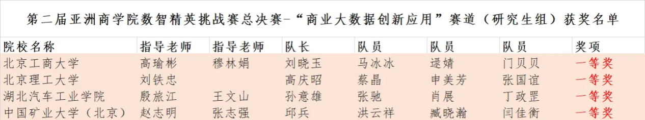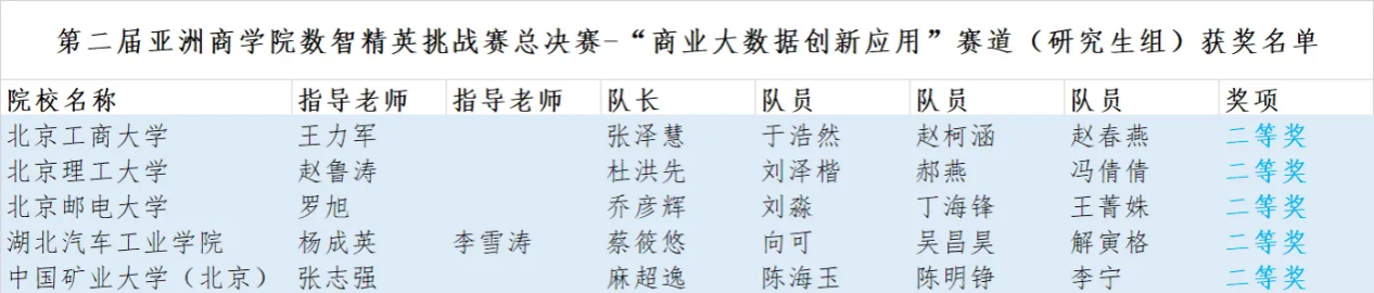 近日,由中国商业经济学会主办的第二届亚洲商学院数智精英挑战赛暨第五届全国大学生智慧商务大数据创新应用大赛总决赛(研究生组)成绩揭晓。