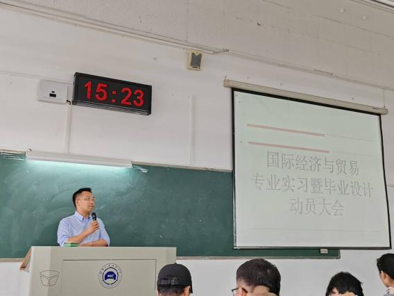 接着,程文明副主任对2025届本科毕业设计工作的各个节点、注意事项和具体要求进行了讲解,他对国际经济与贸易专业毕业设计资料内容及规范等进行了细致的讲解。会上,他对毕业设计指导老师的分配工作做介绍,毕业设计指导教师按照分组与学生见面,建立本次专业实习及毕业设计工作的微信/QQ交流群,选定小组联络员,并对同学们现场提问进行了解答。