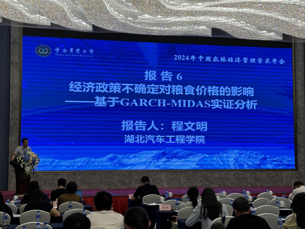 程文明副教授在学术年会上,首先向各专家学者简短的介绍了湖北省十堰市和湖北汽车工业学院,让更多专家学者了解到十堰这座城市以及湖北汽车工业学院,并赢得了十分不错的反响。随后,对最新研究成果《经济政策不确定性对粮食价格的影响—基于GARCH--MIDAS的实证分析》进行了详细的汇报,中国人民大学生吉萍教授和四川农业大学蓝红星教授对文章进行了点评,并得到了两位教授的正向评价。
