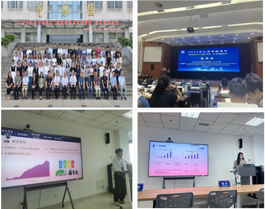 2024年8月18-20日,由江苏省管理类研究生教育指导委员会主办,南京信息工程大学承办的2024年江苏省研究生“绿色经济与‘双碳’管理”学术创新论坛在江苏省南京市召开。来自全国各地知名高校的10位国家杰青等专家学者,5位研究生教育指导委员会主任、秘书长、高校院长以及90余名高校师生参加了本次学术活动。论坛以“低碳经济与绿色智慧供应链管理”为主题,探讨低碳经济与绿色供应链管理领域的前沿理论与实务问题,为广大研究生及相关领域的学者提供一个高水平的学术交流平台。湖北汽车工业学院经济管理学院2022级研究生牟光远、2023级研究生陈婉灵分别做了主题汇报。
