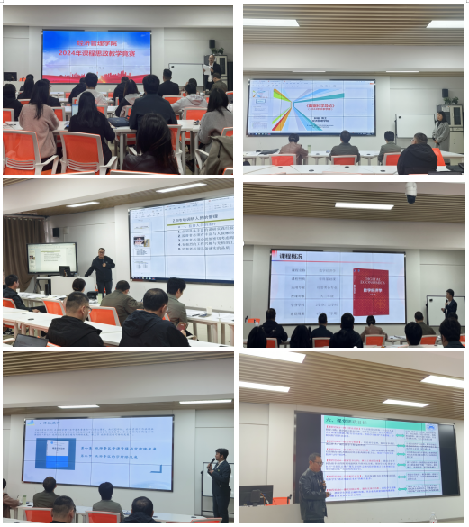 活动中还举行了经济管理学院2024年课程思政教学竞赛。5位参赛选手分别从课程思政说课、教学展示两个环节进行汇报,紧扣课程特点,案例详实生动、思政元素丰富、教学设计精巧,博得现场与会教师的阵阵掌声。现场专家评委对选手们的课程思政教学设计、现场说课方式、教学展示技巧等方面进行了细致的点评。