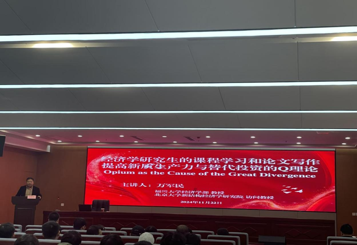 2024年11月22日下午,福冈大学的万军民教授应经济管理学院邀请,在产教楼三楼报告厅为经管院师生带来了一场精彩讲座。本场讲座由经济管理学院副院长李保林主持,研究生、本科生积极到场,与学院教师共享这场学术盛宴。