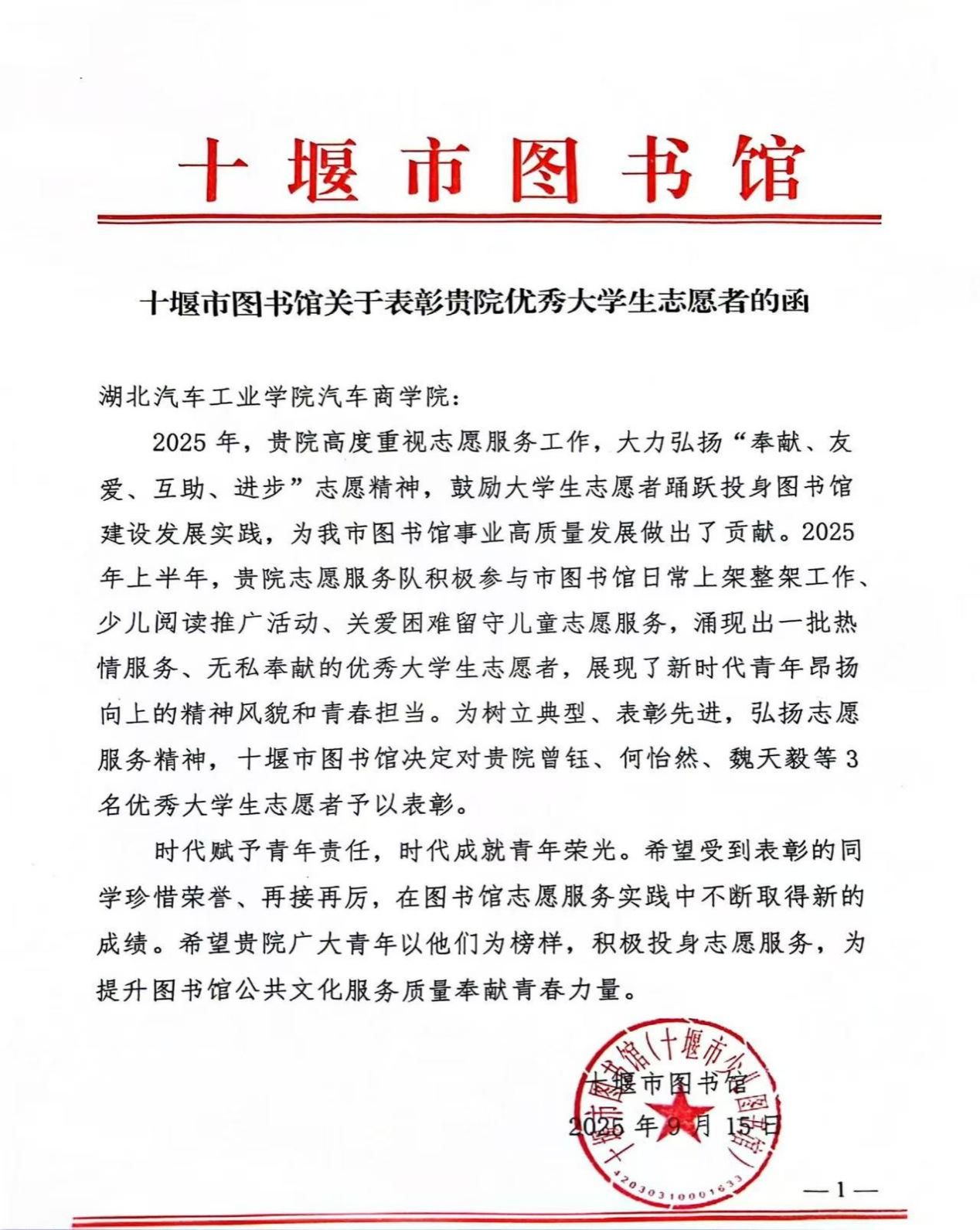 近日,必赢亚州242.,net收到一封来自十堰市图书馆少儿借阅部的感谢信,信中高度赞扬了学院志愿者在2025年以来提供的优质志愿服务,并对他们展现的专业素养与青春担当予以充分肯定。
