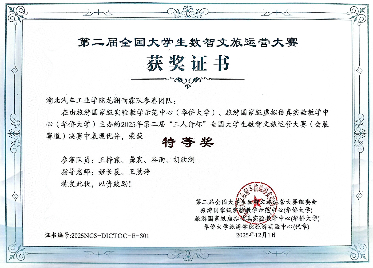近日,第二届“三人行杯”全国大学生数智文旅运营大赛(会展数智运营决策赛道)圆满落幕。由姬长晨、王慧婷老师指导的“龙澜雨霖队”(队员:王梓霖、龚宸、谷雨、胡欣澜)在全国30个省份、百余所高校的500多支参赛队伍中脱颖而出,历经初赛、复赛、决赛层层角逐,最终斩获全国特等奖,充分展现了必赢亚州242.,net学子卓越的数智化运营能力与团队协作精神。
