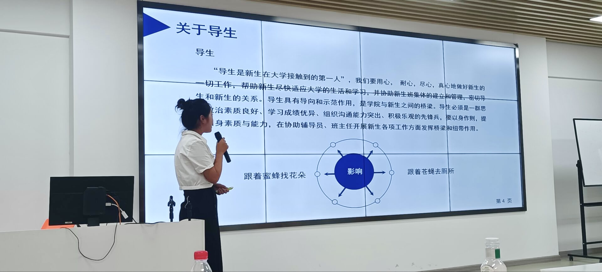 会议第二阶段,优秀导生代表王佳月分享了自己做导生的经验,希望帮助在座的各位新生导生,会议上,王佳月提出各位导生应当积极配合班主任的工作开展,帮助新生尽快适应大学生活,培养出班级的骨干力量,深入推动学生工作的开展,导生应提升自身的责任意识与管理意识,不断完善、细致自己的工作任务,理顺流程、卡实责任,全力推进新生工作开展。