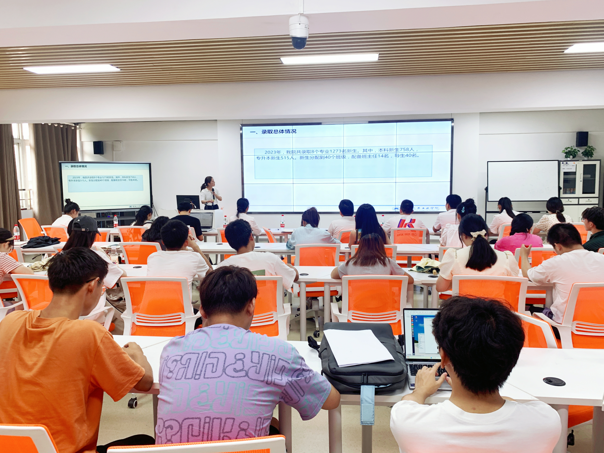 会议第一阶段,张倩向与会人员详细介绍了我校新老校区开展迎新工作的具体情况及各部门的任务分工,提出了班主任的角色定位,指出班主任应当作为学生的思想引领者、班级建设者以及学业的指导者,大一应当多与学生交流,大二多抓学生的竞赛,大三就应当确定每位同学的发展方向,大四助就业。