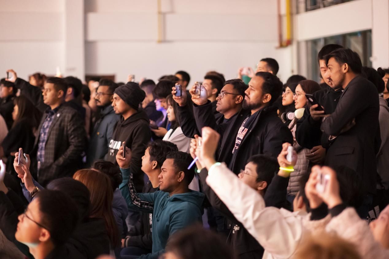 音乐会上,同学们热情高涨,当歌曲婉转动情时,大家静静聆听,沉醉在歌曲故事之中;当歌曲激情欢快时,同学们随着节奏律动为演唱者应援;当歌者演唱传唱度高的歌曲时,同学们挥舞着荧光棒和手电,与演唱者一同合唱。现场氛围温暖欢快,热烈又富有真情。除了独唱外,还有精彩的群舞表演。来自星空舞社、外国语学院的团舞表演展现了汽院学子的靓丽青春;国际教育学院的外籍学子表演了孟加拉国多元文化集体舞,彰显出异域风采和音乐的魅力。尽管语言不通、文化不同,但通过音乐交流,语言不再是障碍、文化不再分优劣,聚集起的一个个音程,是我们同频的呼吸,让人沉浸其中、乐而忘返。