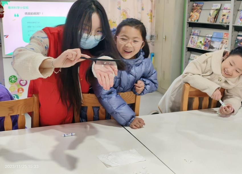 在本次活动中,志愿者带领小朋友们进行了彩虹雨、弹跳鸡蛋、静电现象等科学小实验活动,以此来拓宽小朋友们的知识领域。除此之外,小朋友们通过亲身实践来观察、探究和发现科学现象,培养其好奇心和探究精神。志愿者也与小朋友们进行了知识积分比赛,小朋友们通过快问快答、限时积分以及抢答赛来参与游戏,比赛中浓厚的学习氛围也激发了小朋友们的学习兴趣和动力。