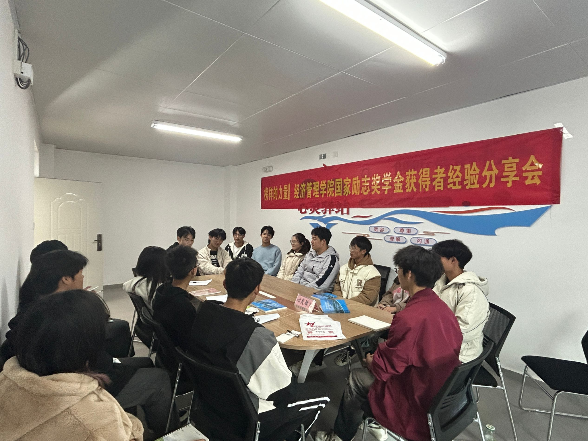 为发挥资助育人作用,强化榜样引领,扩大示范效应,帮助2023级新生找准大学目标、激发学习动力,11月27日下午,经济管理学院组织2名获得国家励志奖学金的优秀学生,以“榜样的力量,我的青春故事”为主题,在经济管理学院梅园公寓“青年之家”分享自己学习和生活经验,2023级学生代表参加。
