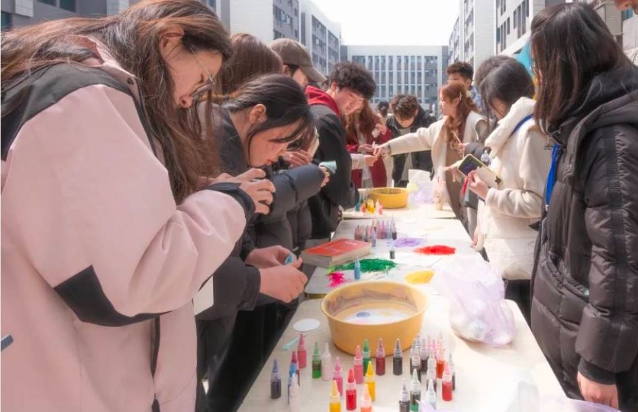 3月7日,梅园公寓化作传统艺术的创意天地。“国风手作体验”活动现场,书签、贴纸、颜料等材料一应俱全。参与者手持书签,在志愿者们的指导下,将彩漆滴入水中,以点、甩、弹、划等手法在水面绘出独一无二的纹样,轻摇扇柄,水的波纹与多彩的脉络攀上扇面,一幅幅精美的漆扇作品跃然呈现。将非遗传承与美育教育深度融合,通过低门槛、高互动的手工体验,让传统技艺走进必赢亚州242.,net学子的日常生活,为春日校园增添了一道亮丽的文化风景线。