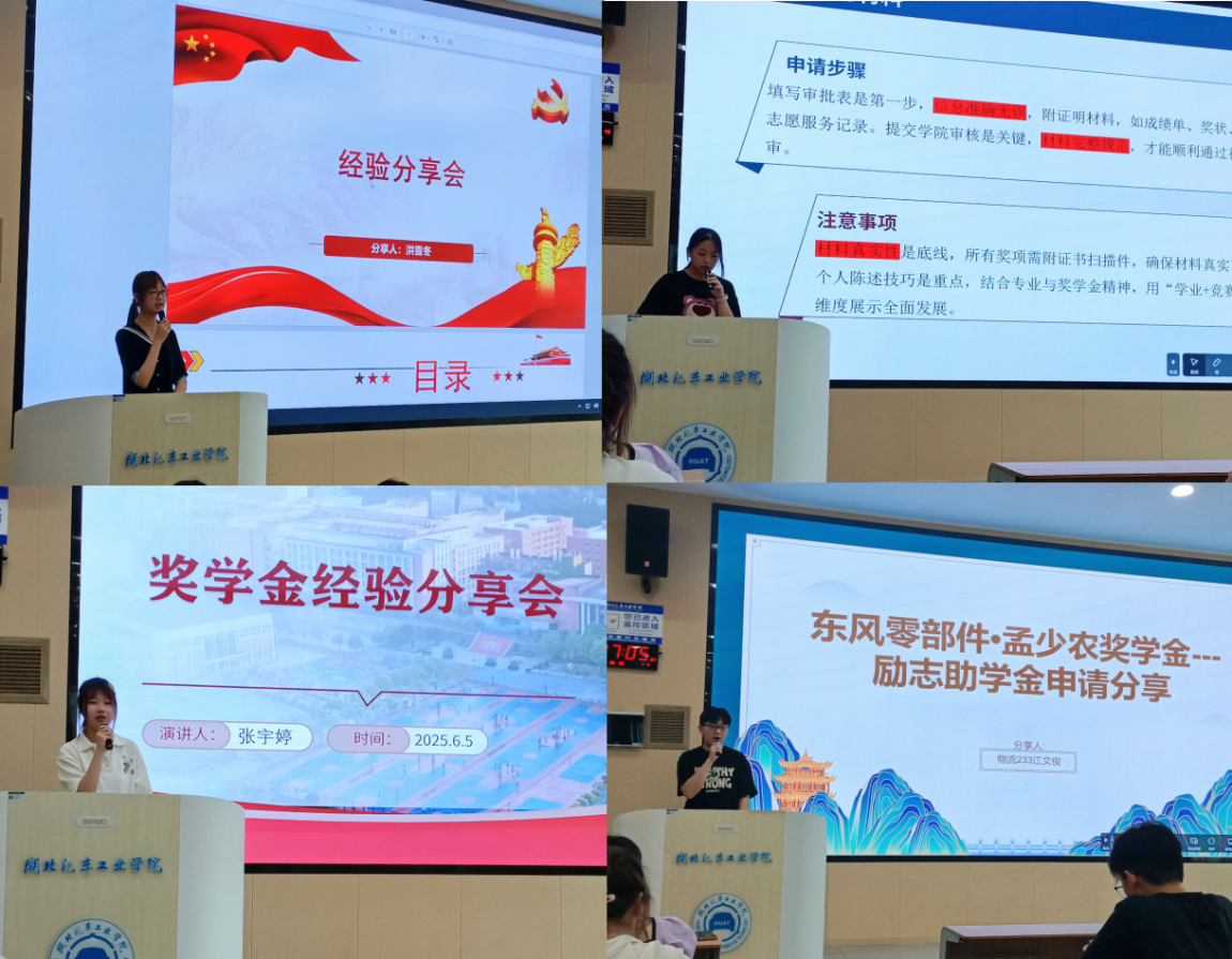活动中,由奖学金获得者进行经验分享。蓝恩奖学金获得者洪雪冬、东方零部件·孟少农奖学金获得者张宇、东风·孟少农奖学金获得者张雨婷、东方零部件·孟少农奖学金获得者江文俊四位同学依次登台。他们从学科竞赛信息获取与备赛技巧到奖助学金体系的差异梳理等不同维度为同学们分享奖学金申请与成长成才的经验,赢得了现场师生的阵阵掌声。在互动交流环节,现场同学积极举手提问,就社会奖学金申请过程中的疑问和学习等问题与四位获奖者进行了深入交流。获奖者们耐心解答,结合自身经验给出了切实可行的建议。 分享环节结束后,屈田田老师作总结发言。她首先对四位分享者的精彩呈现给予高度评价,并提出三点期望:一是要坚守诚信底线,确保申报材料真实性,奖学金申请容不得半点虚假,这是诚信立身的基本要求;二是要关注家庭贫困学生入库问题,鼓励有需要的同学积极入库,学院会在助学金评定中优先考量,保障公平;三是肯定四位社会奖学金获得者的优秀,也祝贺在场人民奖学金获得者,勉励同学们以榜样为镜,在学业、实践中持续奋进,让青春在追求卓越中闪光。