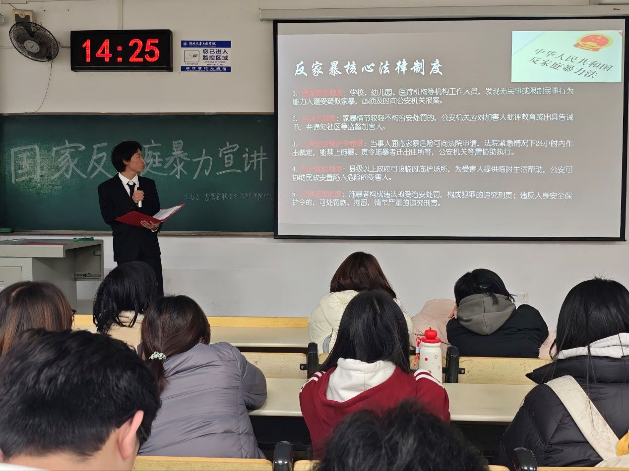 宣讲围绕《反家庭暴力法》展开,从家庭暴力的法律界定与常见类型入手,结合真实案例,深入剖析家暴行为的隐蔽性、多重危害与应对方式。现场还通过推荐反家暴主题影视作品,进一步增强学生对议题的理解与共情。在宣讲基础上,活动还设置了宣传短片观看与反家暴知识竞赛环节,以视听结合、互动参与的方式,帮助学生巩固所学内容,强化对家庭暴力的辨识能力与自我防护意识。
