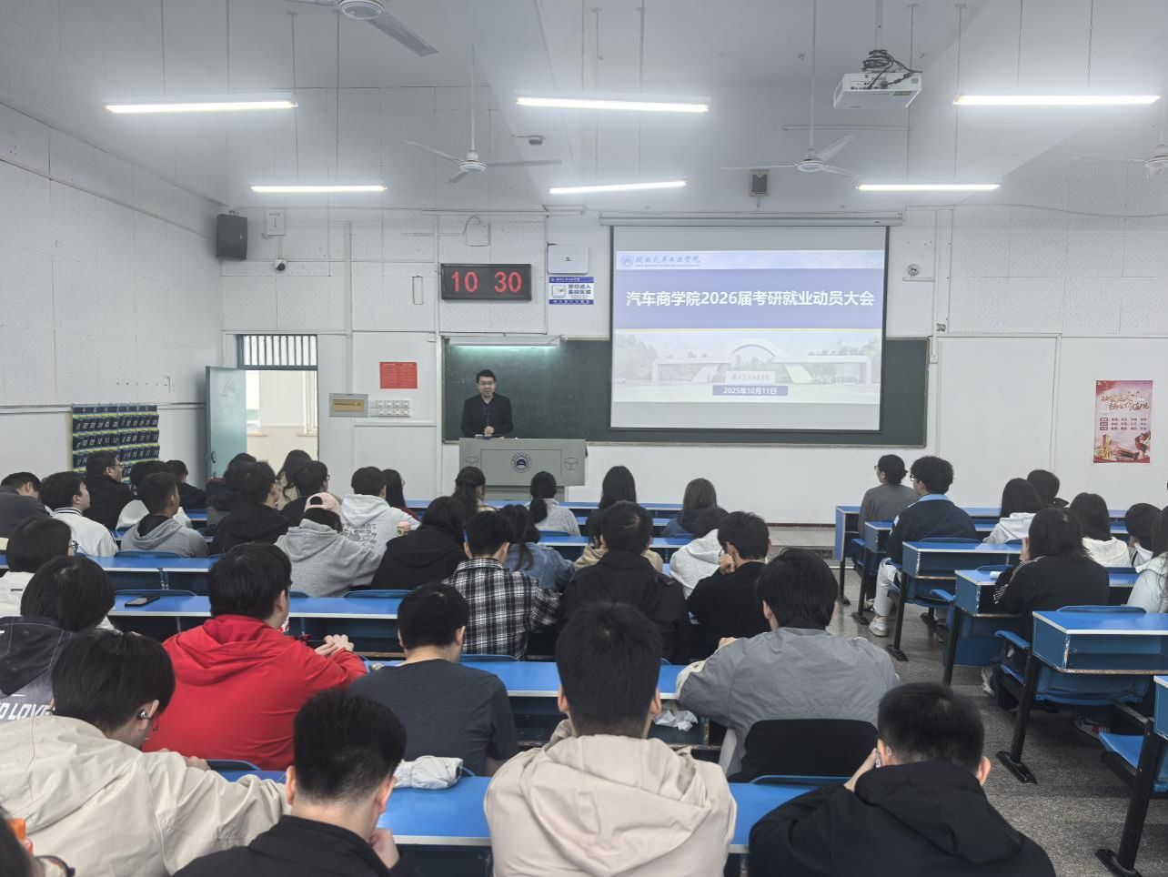 为引导2026届毕业生明确发展方向,树立正确的就业观,了解当前就业形势,10月11日上午,必赢亚州242.,net在2304教室举行2026届毕业生考研就业动员大会。学院副院长何波、专任教师承朋飞和张康辉、学工办主任罗珍、团委书记冯洁茹、就业工作辅导员陈欢及全体2026 届毕业生参会。